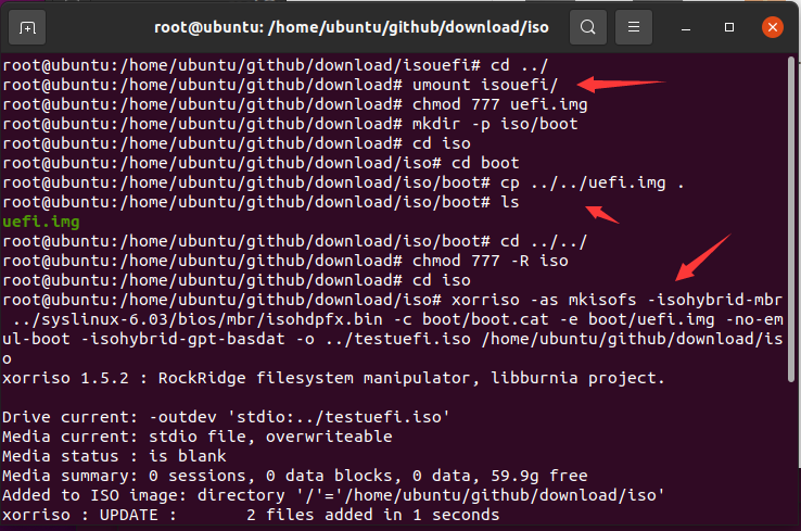 4、接著利用umount命令取消掛載,這樣我們就得到一個(gè)包含內(nèi)核、文件系統(tǒng)等的img文件,接著創(chuàng)建一個(gè)iso文件夾,并且在該文件夾下面將創(chuàng)建一個(gè)boot文件夾,然后將img復(fù)制到iso/boot下面,最后利用xorriso工具生成iso文件即可,如下圖所示: