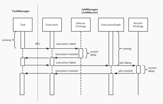 Flink 的錯(cuò)誤恢復(fù)機(jī)制分為多個(gè)級(jí)別,即 Execution 級(jí)別的 Failover 策略和 ExecutionGraph 級(jí)別的 Job Restart 策略。當(dāng)出現(xiàn)錯(cuò)誤時(shí),F(xiàn)link 會(huì)先嘗試觸發(fā)范圍小的錯(cuò)誤恢復(fù)機(jī)制,如果仍處理不了才會(huì)升級(jí)為更大范圍的錯(cuò)誤恢復(fù)機(jī)制,具體可以看下面的序列圖。