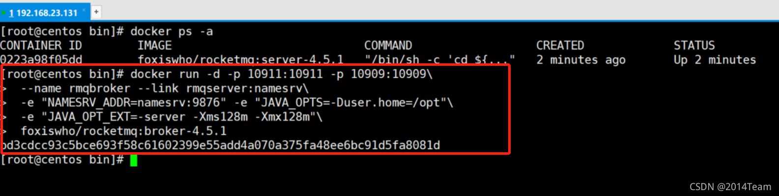docker run -d -p 10911:10911 -p 10909:10909\ --name rmqbroker --link rmqserver:namesrv\ -e "NAMESRV_ADDR=namesrv:9876" -e "JAVA_OPTS=-Duser.home=/opt"\ -e "JAVA_OPT_EXT=-server -Xms128m -Xmx128m"\ foxiswho/rocketmq:broker-4.5.1