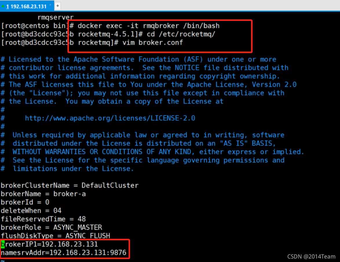 docker exec -it rmqbroker /bin/bash cd /etc/rocketmq/ vi broker.conf
