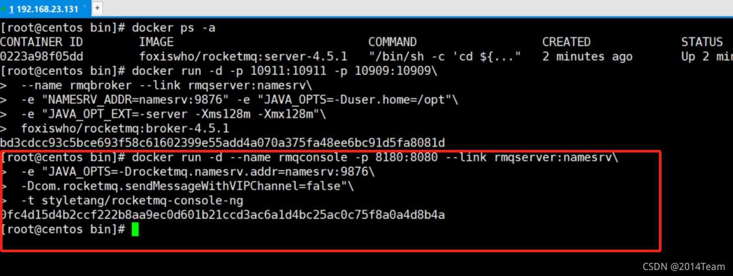 docker run -d --name rmqconsole -p 8180:8080 --link rmqserver:namesrv\ -e "JAVA_OPTS=-Drocketmq.namesrv.addr=namesrv:9876\ -Dcom.rocketmq.sendMessageWithVIPChannel=false"\ -t styletang/rocketmq-console-ng