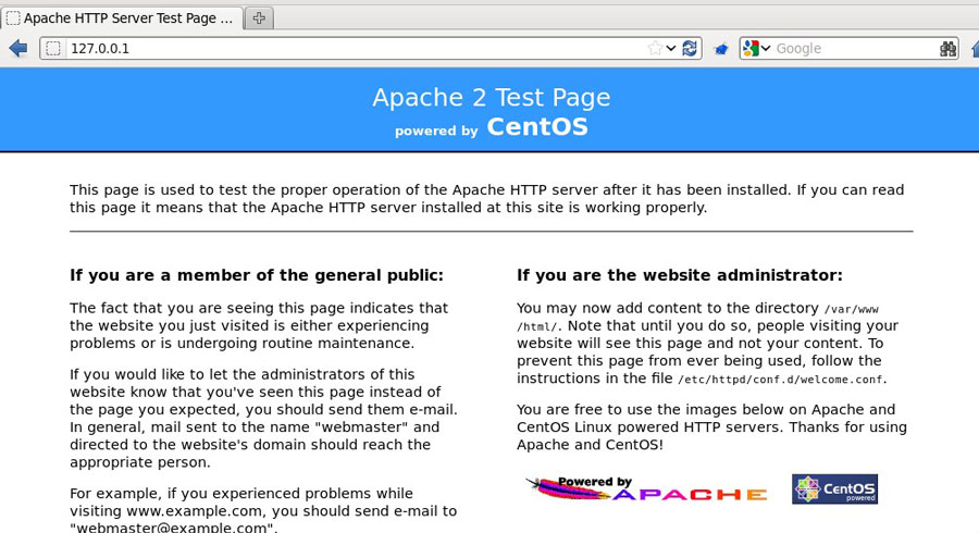 然后打開瀏覽器,輸入我們的 127.0.0.1 來訪問,此時看到的界面是Apache的測試界面:
