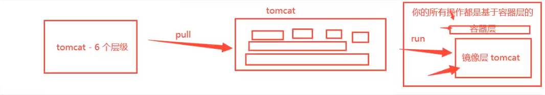 - 這一層就是我們通常說的容器層(run),容器之下的都叫鏡像層(遠程pull)!