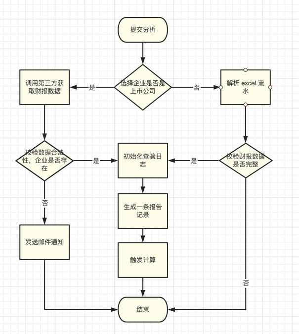 上市企業(yè):判斷名稱是否存在 ,不存在則發(fā)送郵件并中止計(jì)算-> 從數(shù)據(jù)庫(kù)拉取財(cái)報(bào)數(shù)據(jù),初始化查驗(yàn)日志、生成一條報(bào)告記錄,觸發(fā)計(jì)算-> 根據(jù)失敗與成功修改任務(wù)狀態(tài) 。