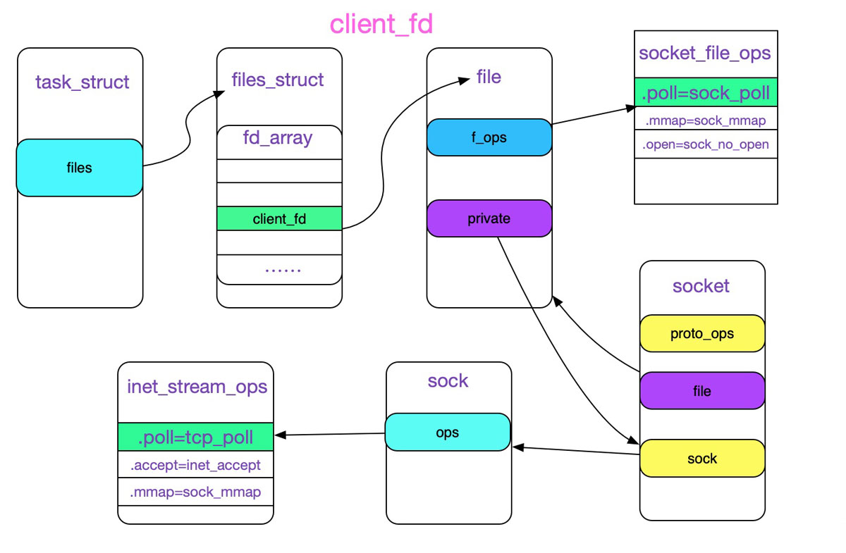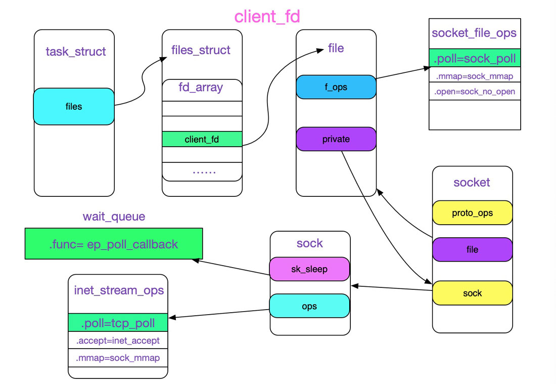 本文講述的是kernel是如何將就緒事件傳遞給epoll并喚醒對(duì)應(yīng)進(jìn)程上,因此在這里主要聚焦于(wait_queue_head_t wq)等成員。