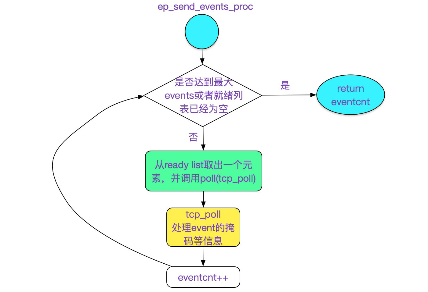 將epoll_wait進(jìn)程推入可運(yùn)行隊(duì)列,等待內(nèi)核重新調(diào)度進(jìn)程,然后epoll_wait對(duì)應(yīng)的這個(gè)進(jìn)程重新運(yùn)行后,就從schedule恢復(fù),繼續(xù)下面的ep_send_events(向用戶空間拷貝事件并返回)。