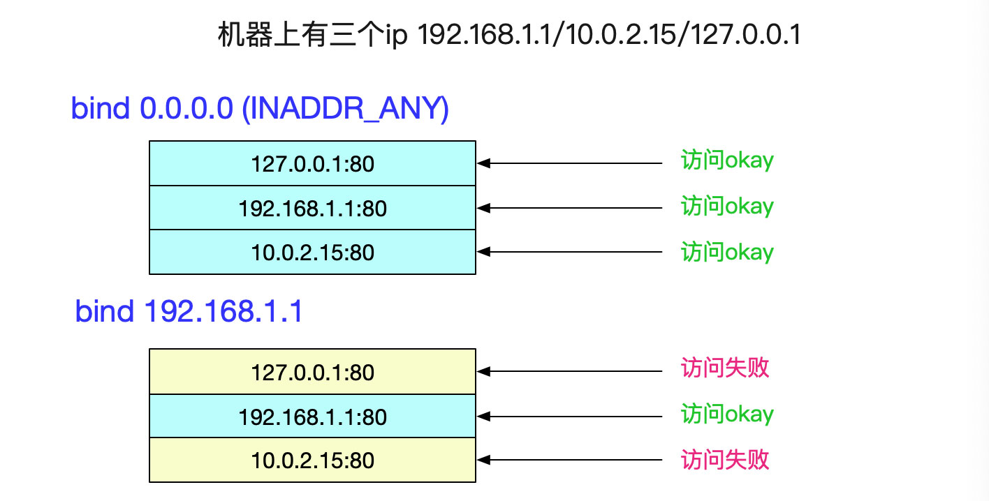 我們的bind允許綁定到0.0.0.0即INADDR_ANY這個(gè)地址上(一般都用這個(gè)),它意味著內(nèi)核去選擇IP地址。對(duì)我們最直接的影響如下圖所示: