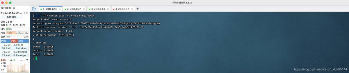 首先進(jìn)入 mongo 容器內(nèi),登錄用戶 admin 12345678,執(zhí)行 show dbs 查看數(shù)據(jù)庫(kù),此時(shí) mongo 已經(jīng)部署成功