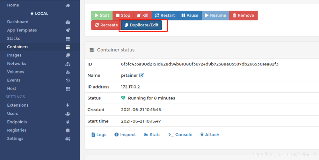 4.常用的一些portainer對docker容器進(jìn)行操作配置都在這里Duplicate/Edit