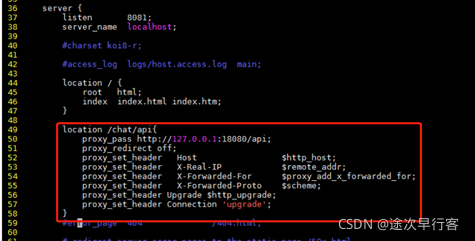 上文配置即將所有訪問路徑中包含/chat/api/的請(qǐng)求都轉(zhuǎn)發(fā)到http://127.0.0.1:18080/api,其中chat是部署的靜態(tài)資源目錄,最后兩行配置是用于支持websocket連接的,即ws協(xié)議。