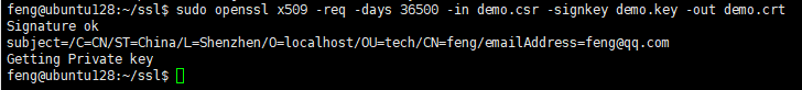 sudo openssl x509 -req -days 36500 -in demo.csr -signkey demo.key -out demo.crt