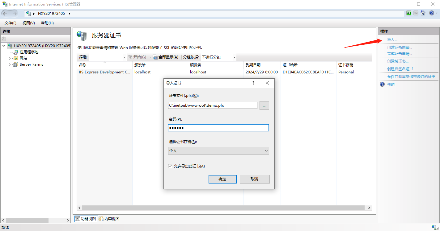 點擊右邊操作的【導(dǎo)入】,選擇創(chuàng)建好的pfx證書文件,輸入創(chuàng)建文件時輸入的密碼(上面第4步創(chuàng)建pfx文件時輸入的密碼,這里是123456):