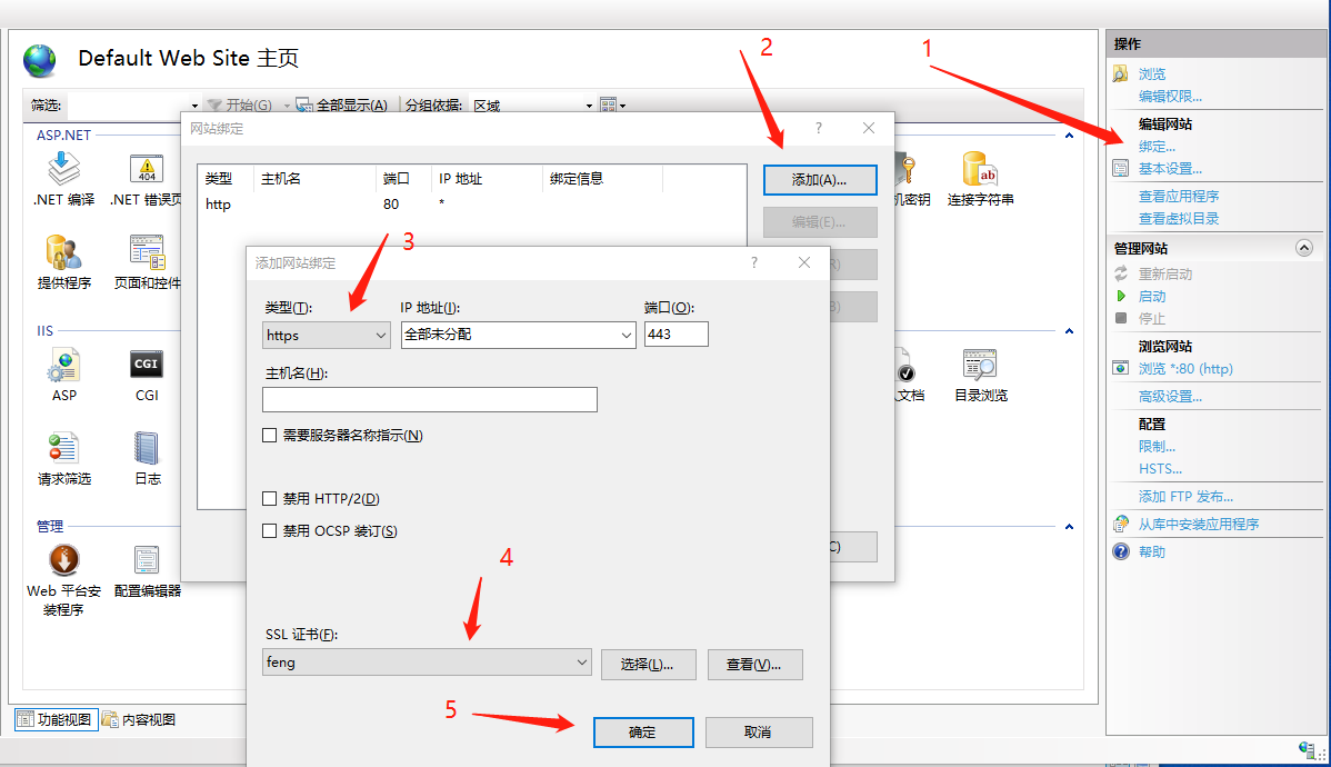 接著選擇你要設(shè)置添加https請求類型的網(wǎng)站,在右邊操作中點擊【綁定】,然后按照下圖操作: