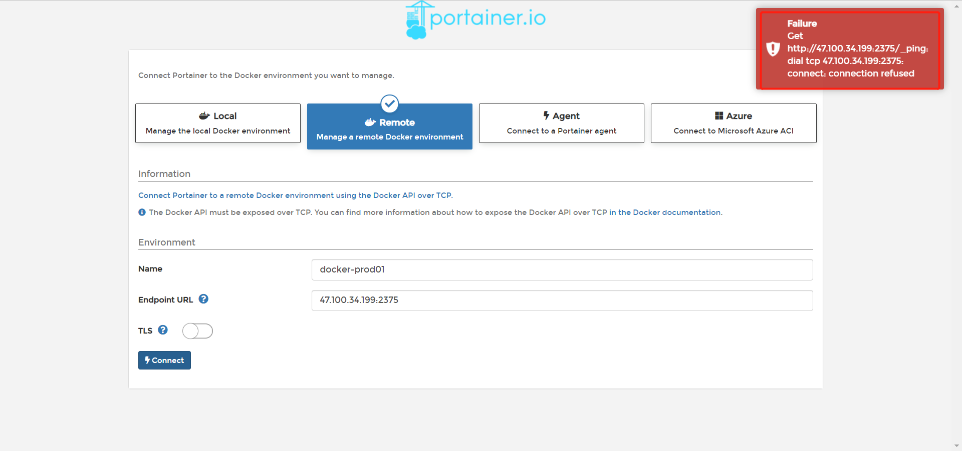 FailureGet http://47.100.34.199:2375/_ping: dial tcp 47.100.34.199:2375: connect: connection refused