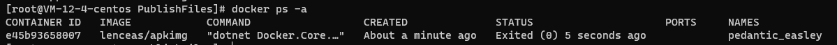 這時(shí)候可以看到多了一個(gè)容器ID為e45b93658007,鏡像是lenceas/apkimg的容器,不過(guò)我們的項(xiàng)目容器是退出狀態(tài),需要開(kāi)啟下: