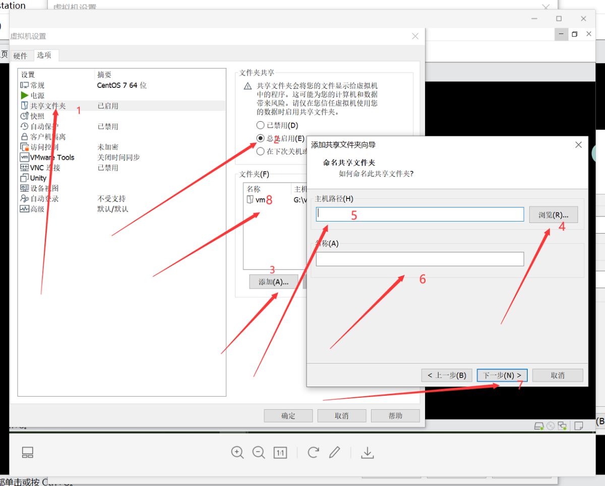 3、在文件夾 :添加共享目錄;彈出窗口點(diǎn)擊下一步--》設(shè)置共享文件夾目錄 地址、共享文件夾名稱(chēng) ---》啟用此共享 --》完成。 虛擬機(jī)設(shè)置完成。