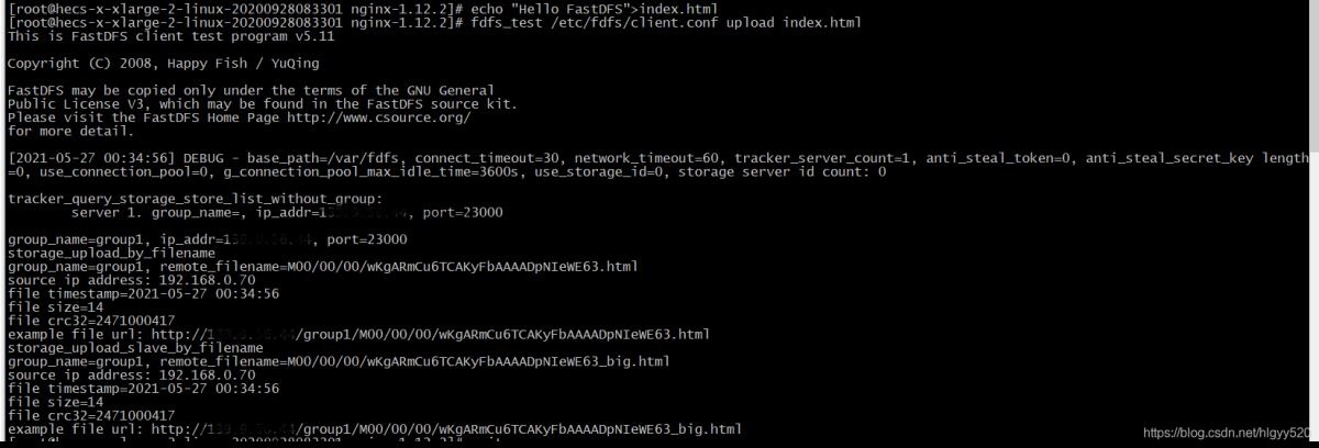 docker exec -it storage /bin/bash echo "Hello FastDFS">index.html fdfs_test /etc/fdfs/client.conf upload index.html