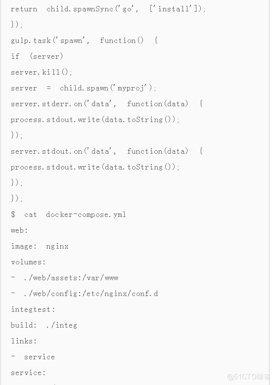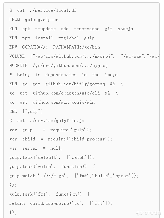 時,會啟動git clone,然后循環(huán)運行;不需要重建image或者重啟容器。每當.go文件發(fā)生變化,Gulp就會重建,并且在運行的容器中重啟我的服務(wù)。就這么簡單。