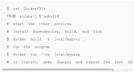 這個案例中,我使用golang資源庫中的onbuildimage作為基礎(chǔ)。其中包括一些很棒的下載依賴包邏輯。這個方法會生成可以方便用于其他非生產(chǎn)環(huán)境的Dockerimage。這個方法對于生產(chǎn)級別的image的問題在于,必須有步驟避免大image并且包括某些初始化腳本,用于啟動和監(jiān)控服務(wù)前驗證狀態(tài)。