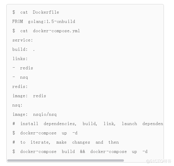 這個示例是一個運行時容器,Compose或者Docker都有合適的工具做到這點。此場景中,也可能更需要一個分布式image,或者可能希望build可以為本機產(chǎn)生一個二進制文件。