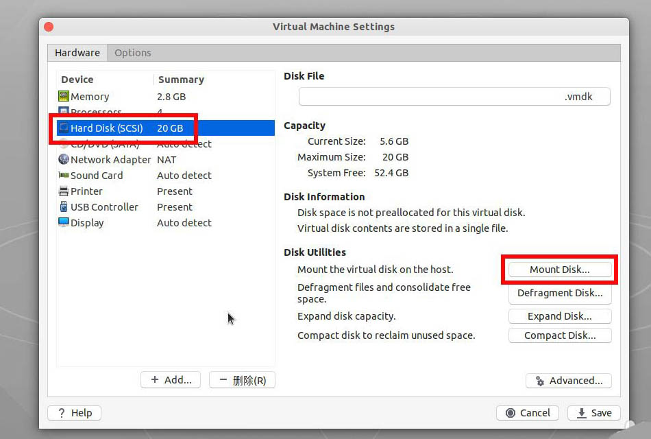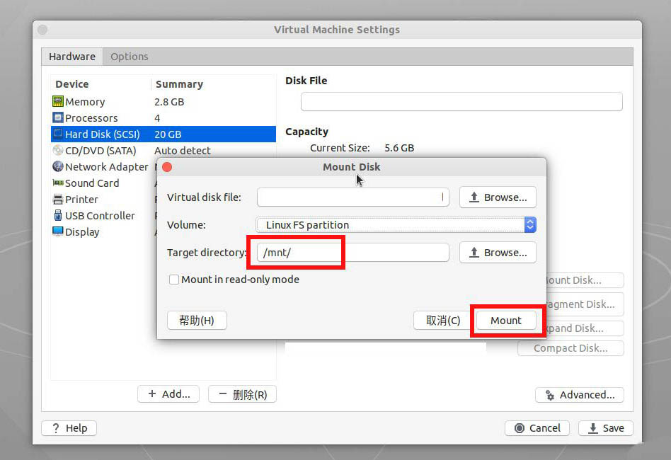 在左邊的選擇我們的 Hard Disk 虛擬硬盤(pán) 選項(xiàng),右邊選擇 Mount Disk...掛載磁盤(pán)。