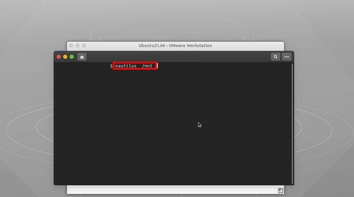 接著我們ctrl+alt+t打開(kāi)終端,在里面使用nautilus mnt命令打開(kāi)我們的mnt文件夾。