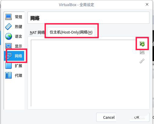 在彈出的界面,選擇”網(wǎng)絡(luò)“——”僅主機(jī)(host-only)網(wǎng)絡(luò)“。點(diǎn)擊如下圖所示的+號(hào)添加。