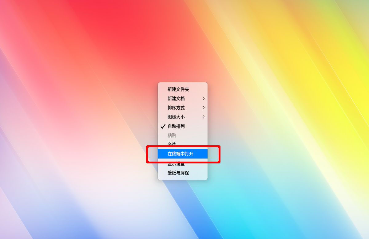首先我們?cè)赿eepin linux的桌面上使用鼠標(biāo)右鍵,在菜單中選擇 在終端中打開。