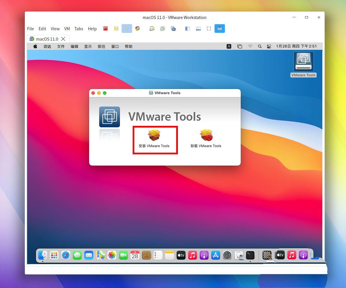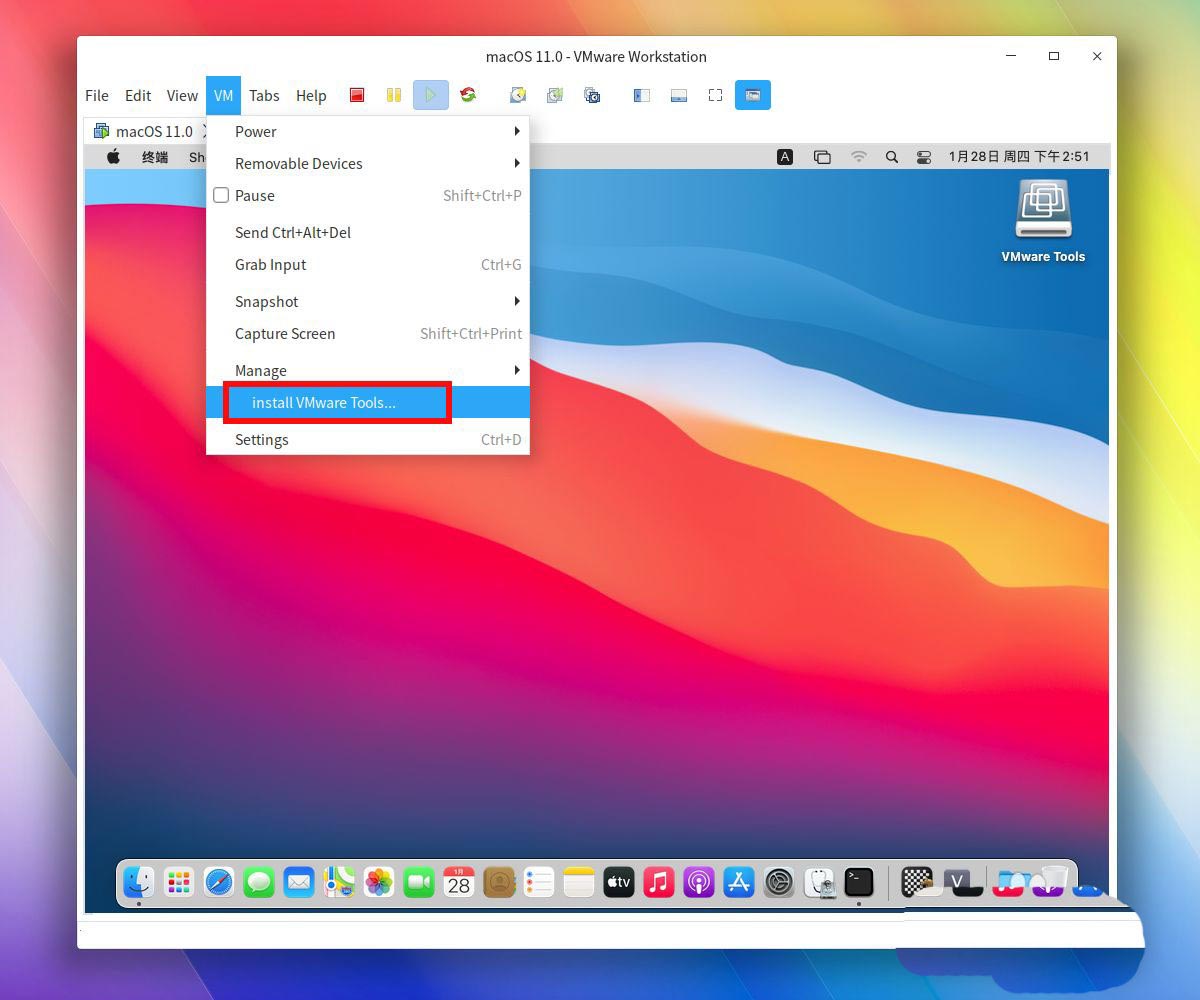 接著我們打開自己的vmware中的macosx11虛擬機(jī)系統(tǒng)窗口,在頂面菜單中選擇VM--install VMware Tools...。