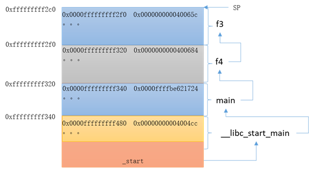 可以看到,f4函數開辟的??臻g也是為48字節(jié),因此,倒推frame3的棧頂為當前的0xfffffffff2c0 + 48字節(jié):0xfffffffff2f0