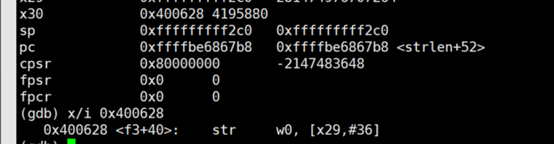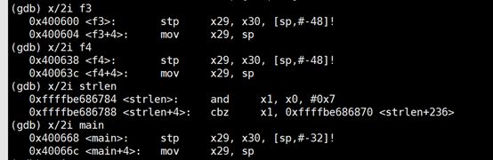 (gdb) x/2i f3 0x400600 <f3>: stp x29, x30, [sp,#-48]! 0x400604 <f3+4>: mov x29, sp