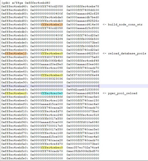 (gdb) x/4i build_node_conn_str 0xaaaacd414d28 <build_node_conn_str(Oid, DatabasePool*)>: stp x29, x30, [sp,#-176]! 0xaaaacd414d2c <build_node_conn_str(Oid, DatabasePool*)+4>: mov x29, sp