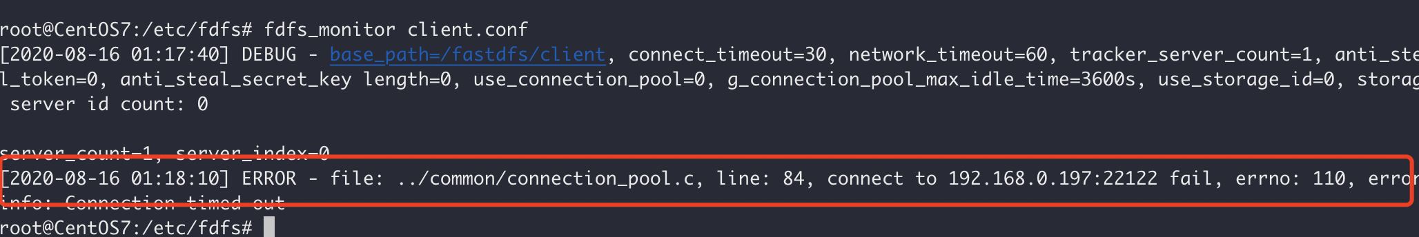 ERROR - file: ../common/connection_pool.c, line: 84, connect to 192.168.209.121:22122 fail, errno: 110, error info: Connection timed out