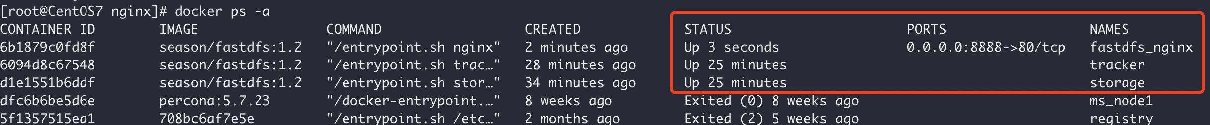 docker run -id --name fastdfs_nginx \ --restart=always \ -v /usr/local/server/fastdfs/data/storage:/fastdfs/store_path \ -v /usr/local/server/fastdfs/nginx/nginx.conf:/etc/nginx/conf/nginx.conf \ -p 8888:80 \ -e TRACKER_SERVER=10.211.55.4:22122 \ season/fastdfs:1.2 nginx
