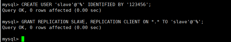 mysql -uroot -p123456 CREATE USER 'slave'@'%' IDENTIFIED BY '123456'; GRANT REPLICATION SLAVE, REPLICATION CLIENT ON *.* TO 'slave'@'%';