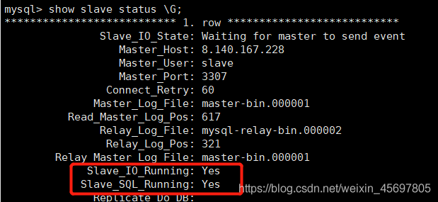 mysql -uroot -p123456 change master to master_host='10.0.3.2', master_user='slave', master_password='123456', master_port=3307, master_log_file='master-bin.000001', master_log_pos=617; start slave; show slave status \G;