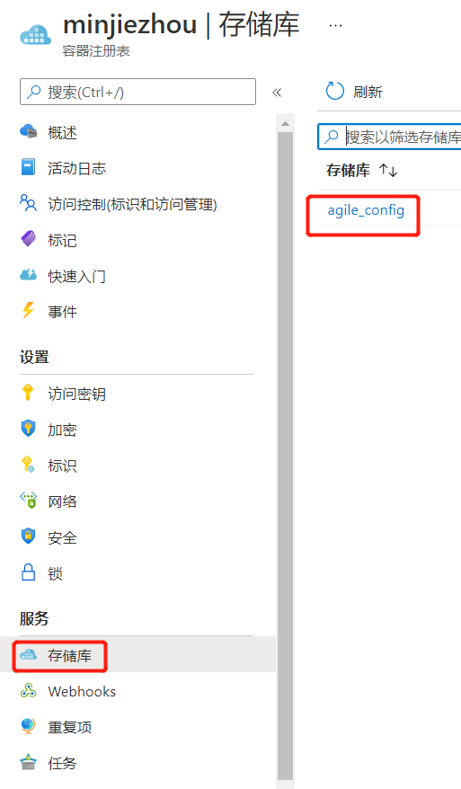 點(diǎn)擊“儲(chǔ)存庫”菜單,可以看到我們的agile_config鏡像已經(jīng)存在了。