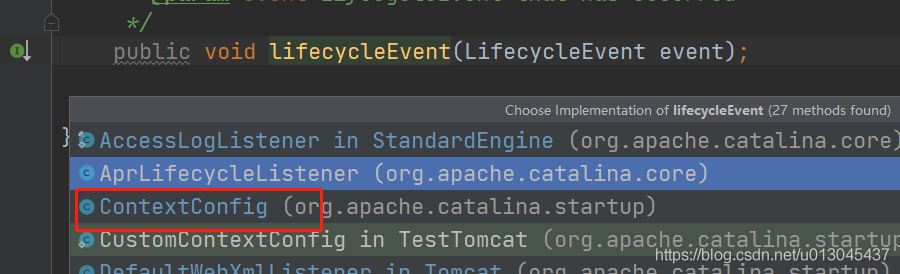 //通過(guò)反射得到的一定是LifecycleListener的一個(gè)實(shí)現(xiàn)類,進(jìn)入getConfigClass得到實(shí)現(xiàn)類(org.apache.catalina.startup.ContextConfig)