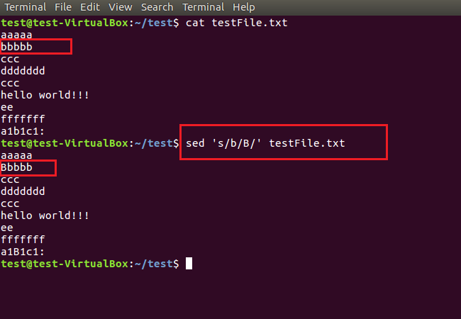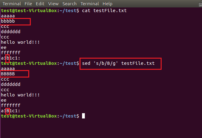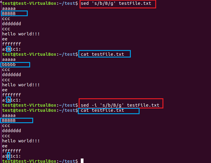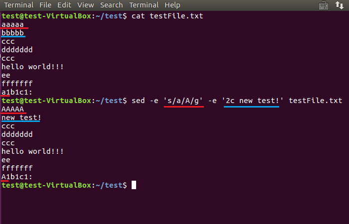6、多個(gè)sed命令也可以用-e參數(shù)連接起來,一次性完成多個(gè)操作。如下圖,首先將小寫a替換成了大寫A,然后又將第二行內(nèi)容替換成了“new test!”