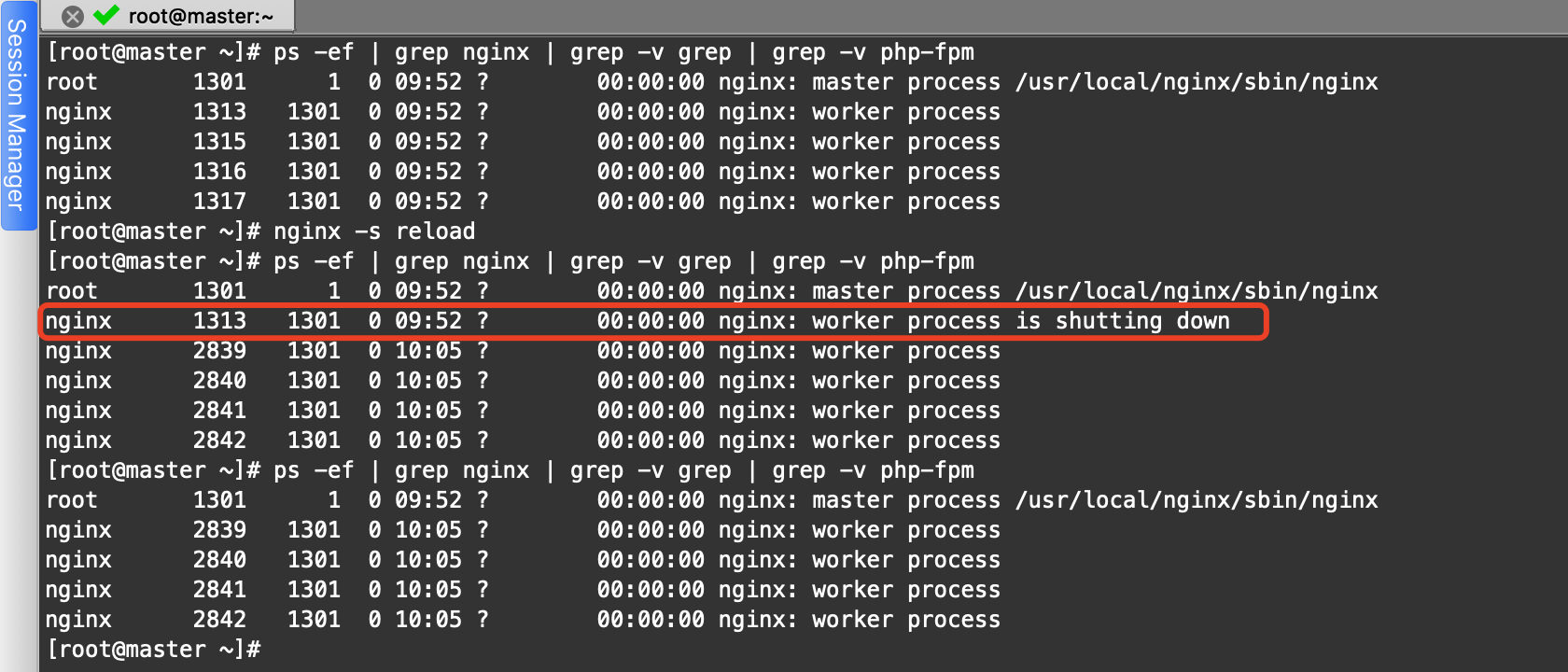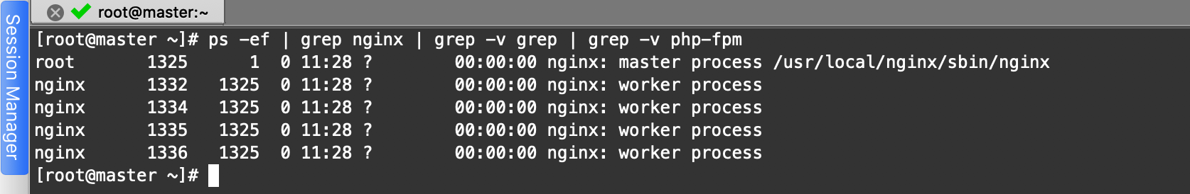 [root@master ~]# ps -ef | grep nginx | grep -v grep | grep -v php-fpm root 1325 1 0 11:28 ? 00:00:00 nginx: master process /usr/local/nginx/sbin/nginx nginx 1332 1325 0 11:28 ? 00:00:00 nginx: worker process nginx 1334 1325 0 11:28 ? 00:00:00 nginx: worker process nginx 1335 1325 0 11:28 ? 00:00:00 nginx: worker process nginx 1336 1325 0 11:28 ? 00:00:00 nginx: worker process
