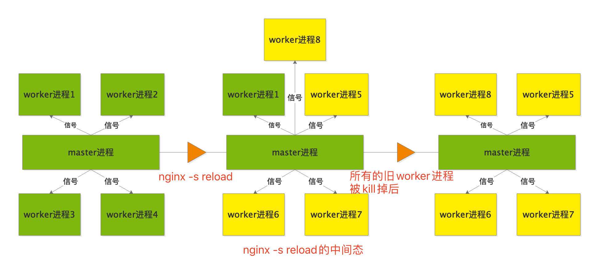 4.執(zhí)行reload命令,master進程會創(chuàng)建4個(與你配置有關(guān))新的worker進程(我上圖中的黃色worker進程),關(guān)閉掉舊的空閑worker進程(綠色worker進程),而正在處理請求的舊worker進程不會立即關(guān)閉,而是會等請求處理完畢就關(guān)閉。