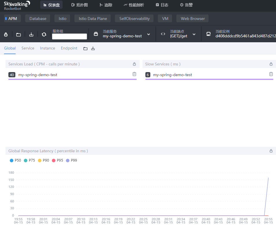查看skywalking 控制臺(tái),并沒(méi)有數(shù)據(jù),因?yàn)樾枰仍L問(wèn)接口,才會(huì)上報(bào)數(shù)據(jù)到控制臺(tái),通過(guò)不斷的調(diào)用測(cè)試接口,再次查看控制臺(tái)可以看到我們的調(diào)用情況,如下圖所示: