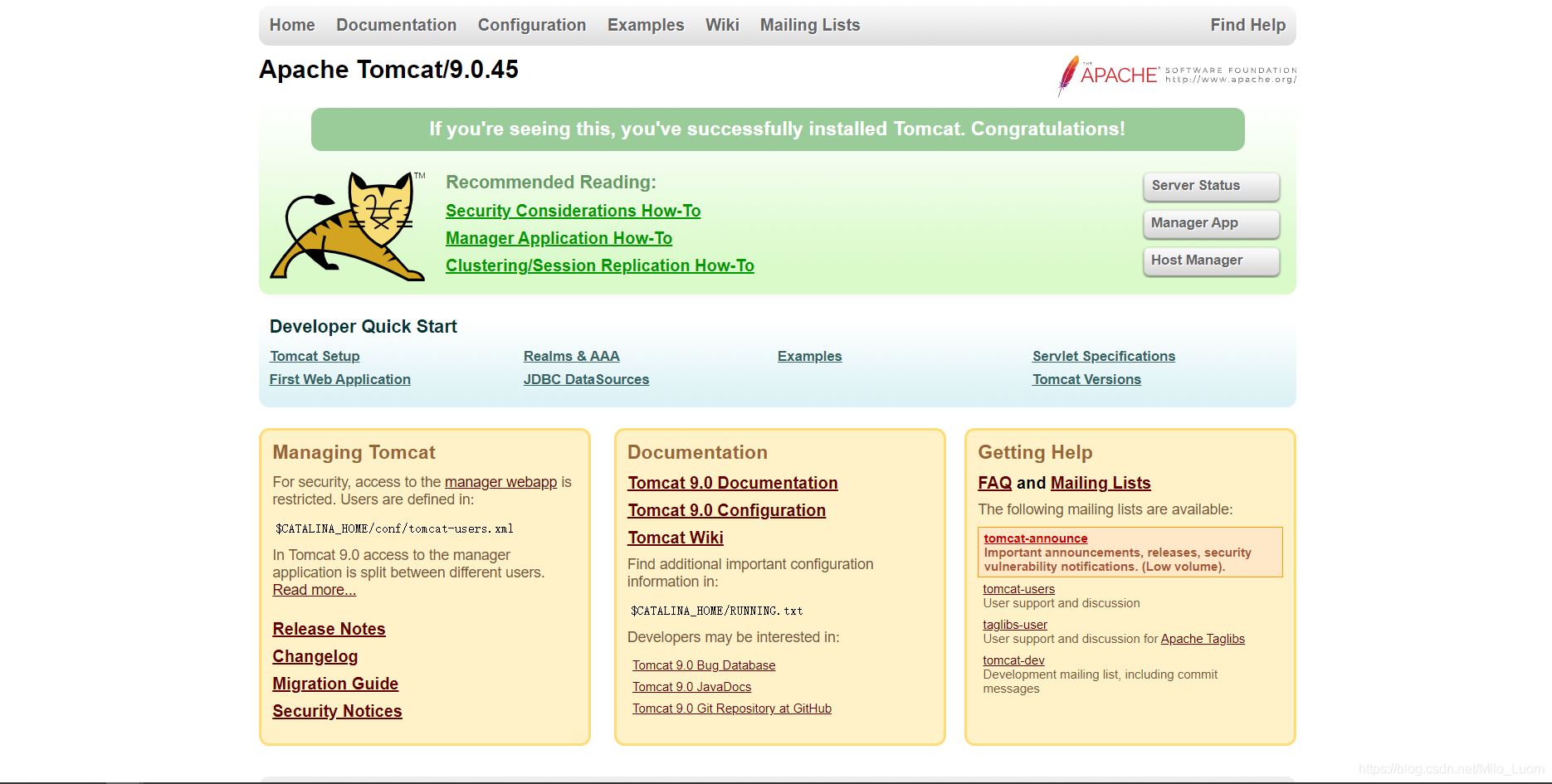 4、在瀏覽器中輸入網(wǎng)址http://localhost:8080,出現(xiàn)以下界面表示Tomcat服務器已經(jīng)成功部署
