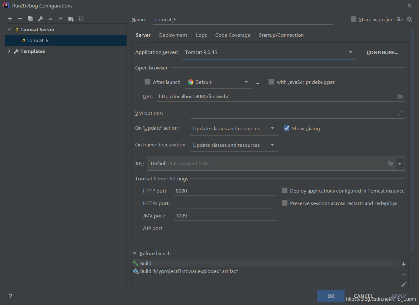 10、在"Run/Debug Configurations"窗口中Name一欄輸入服務器的名字,在“Server”面板中,勾選取消“After Launch”,設置“HTTP port”和“JMX port”(默認值8080即可),點擊Apply -> OK