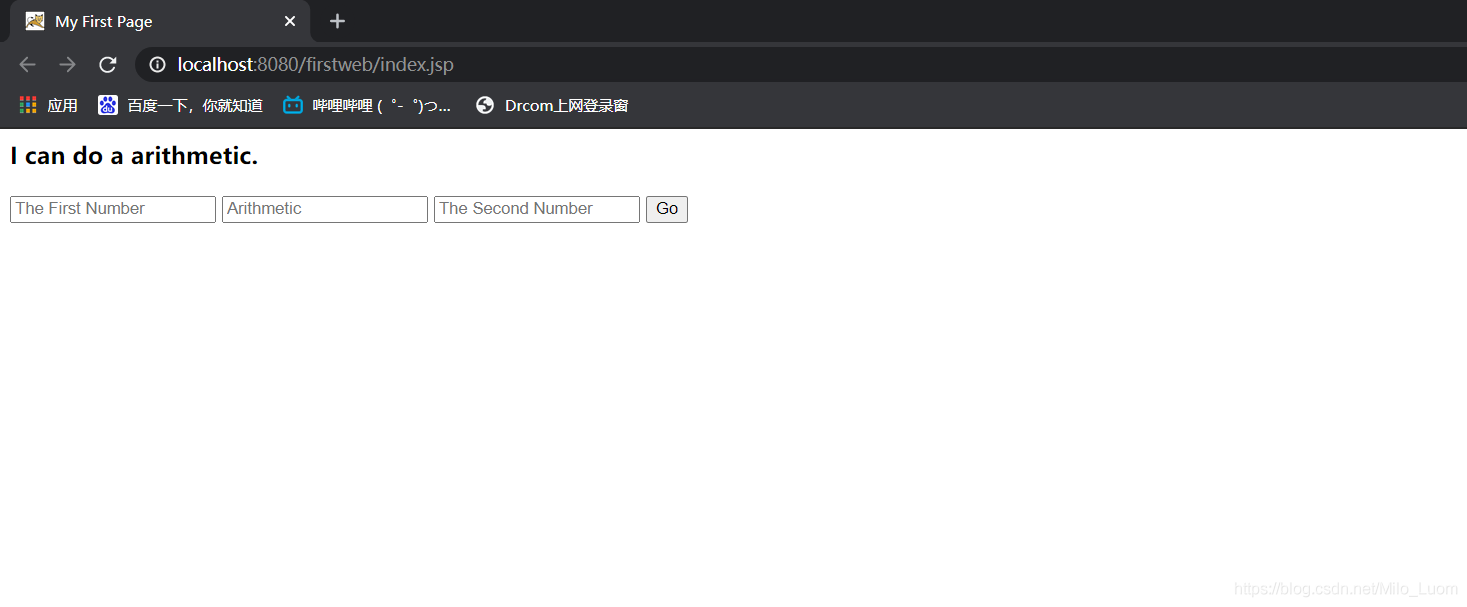 <html> <head> <title>My First Page</title> </head> <body> <h3>I can do a arithmetic.</h3> <div class="_from"> <form action="login" method="get"> <input type="text" name="firstNum" class="firstNum" placeholder="The First Number"> <input typr="text" name="operation" class="operation" placeholder="Arithmetic"> <input type="text" name="secondNum" placeholder="The Second Number"> <input type="submit" name="submit" value="Go"> </form> </div> </body></html>