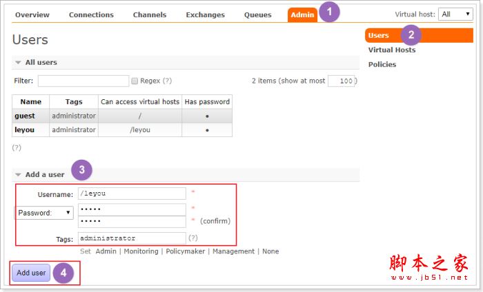 現在,您將需要為RabbitMQ Web管理控制臺創(chuàng)建管理用戶。 運行以下命令相同。