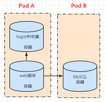 web服務和日志分析存在"超親密關系",因為日志分析模塊要消費web服務模塊產生的日志,所以他們必須部署在同一個服務器上。反之、web服務和MySQL數據庫之間完全可以通過TCP-IP的方式來訪問,就沒有必要部署在同一臺機器上。如果我們用容器運行這個應用,那么web服務需要和日志分析模塊打包在同一個Pod中,而MySQL數據庫服務單獨部署在一個Pod中即可,我們的應用程序遷移到k8s中,可能就是下面的結構:
