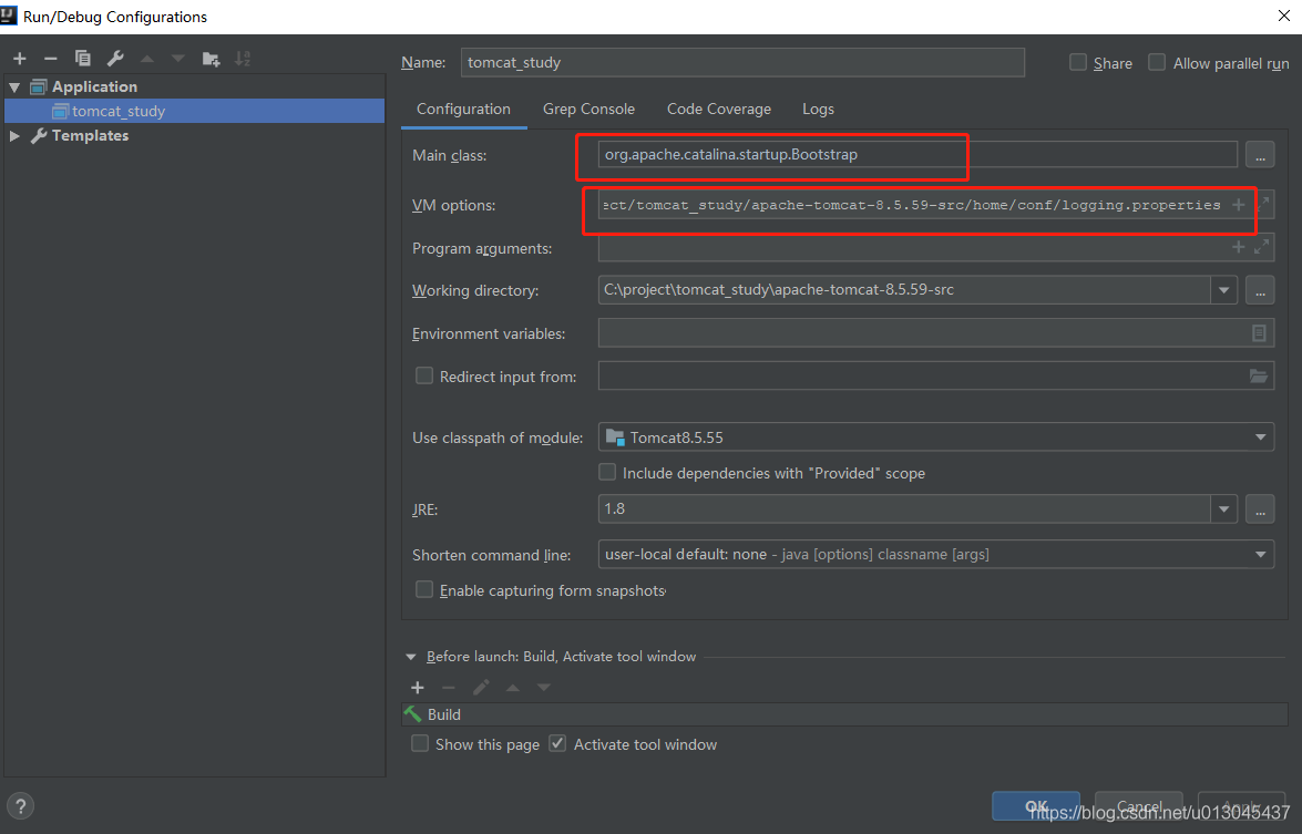 Main class: org.apache.catalina.startup.Bootstrap VM options 按照自己的路徑進(jìn)行修改: -Dcatalina.home=G:/projects/tomcat_study/apache-tomcat-8.5.55-src/home -Dcatalina.base=G:/projects/tomcat_study/apache-tomcat-8.5.55-src/home -Djava.endorsed.dirs=G:/projects/tomcat_study/apache-tomcat-8.5.55-src/home/endorsed -Djava.io.tmpdir=G:/projects/tomcat_study/apache-tomcat-8.5.55-src/home/temp -Djava.util.logging.manager=org.apache.juli.ClassLoaderLogManager -Djava.util.logging.config.file=G:/projects/tomcat_study/apache-tomcat-8.5.55-src/home/conf/logging.properties