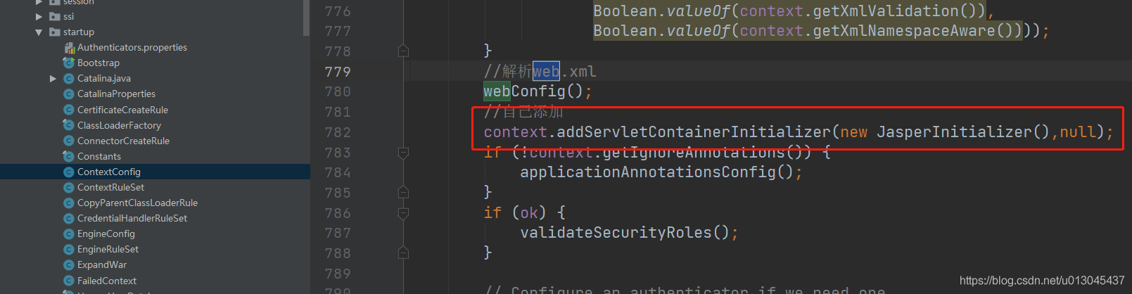 然后打開ContextConfig(org.apache.catalina.startup 下面) 類,加上一行代碼:context.addServletContainerInitializer(new JasperInitializer(),null);