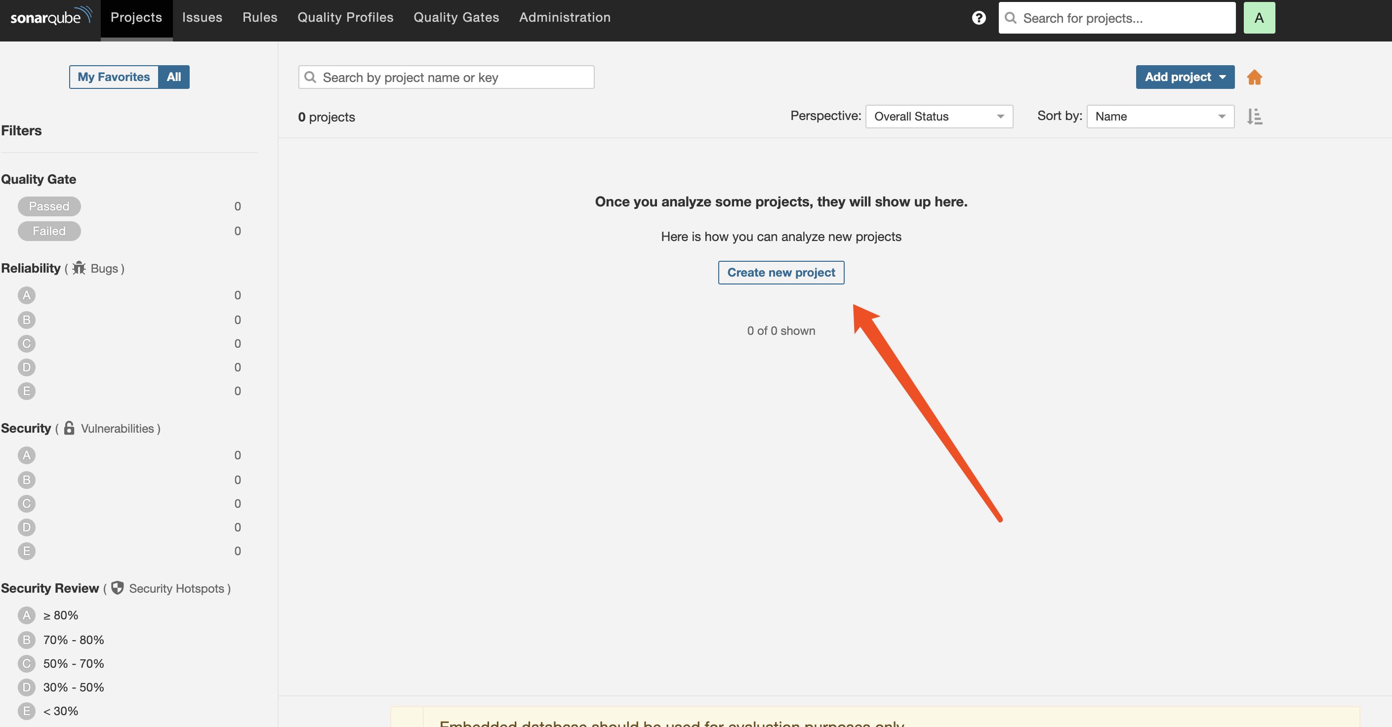 登錄進(jìn)入sonar頁(yè)面后,點(diǎn)擊創(chuàng)建一個(gè)項(xiàng)目